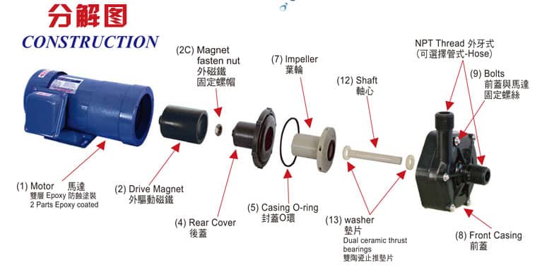 SM型無軸封磁力耐酸堿泵浦特性: .耐強(qiáng)酸強(qiáng)堿:采用純正FRPP/CFRPP/PVDF塑料材質(zhì)射出成型,依客戶使用之化學(xué)性選擇不同材質(zhì)。 .適用 域廣:電鍍、涂裝、蝕刻、表面處理、實(shí)驗(yàn)室、化學(xué)制程等,可耐大部份的化學(xué)性,適合各種酸堿液輸送作業(yè)。 .特殊的鐵氟龍彈性軸封設(shè)計(jì),搭配各種材質(zhì)的軸封如陶瓷、碳精、SSIC 及 Hastelloy-C 合金彈簧 異的耐久及耐腐蝕性。 .結(jié)構(gòu)上:塑料射出成型之底座,輕便,耐腐蝕。