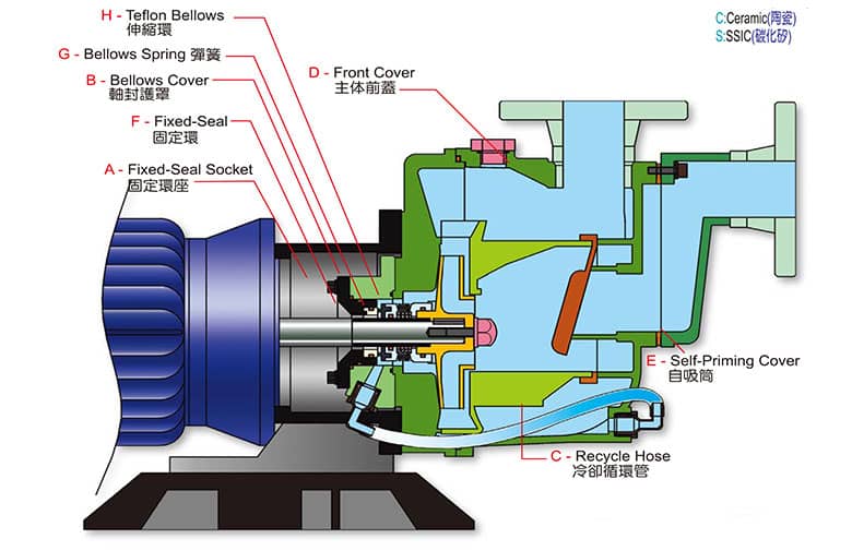 .機(jī)械軸封設(shè)計:采用Teflon Bellows Seal自冷式設(shè)計,并有冷卻循環(huán)回路,在空轉(zhuǎn)時會利用泵內(nèi)部的液體循環(huán)冷卻機(jī)械軸封,軸封材質(zhì):Sic,Carbon,Ceramic。