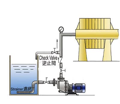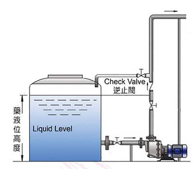 3、當(dāng)配管高度大于8米時,請于出口加裝逆止閥,逆止閥應(yīng)高于液位以上,入口管路加大管徑,如泵入口為2“改配2-1/2”入口管,預(yù)防吸入量的不足。