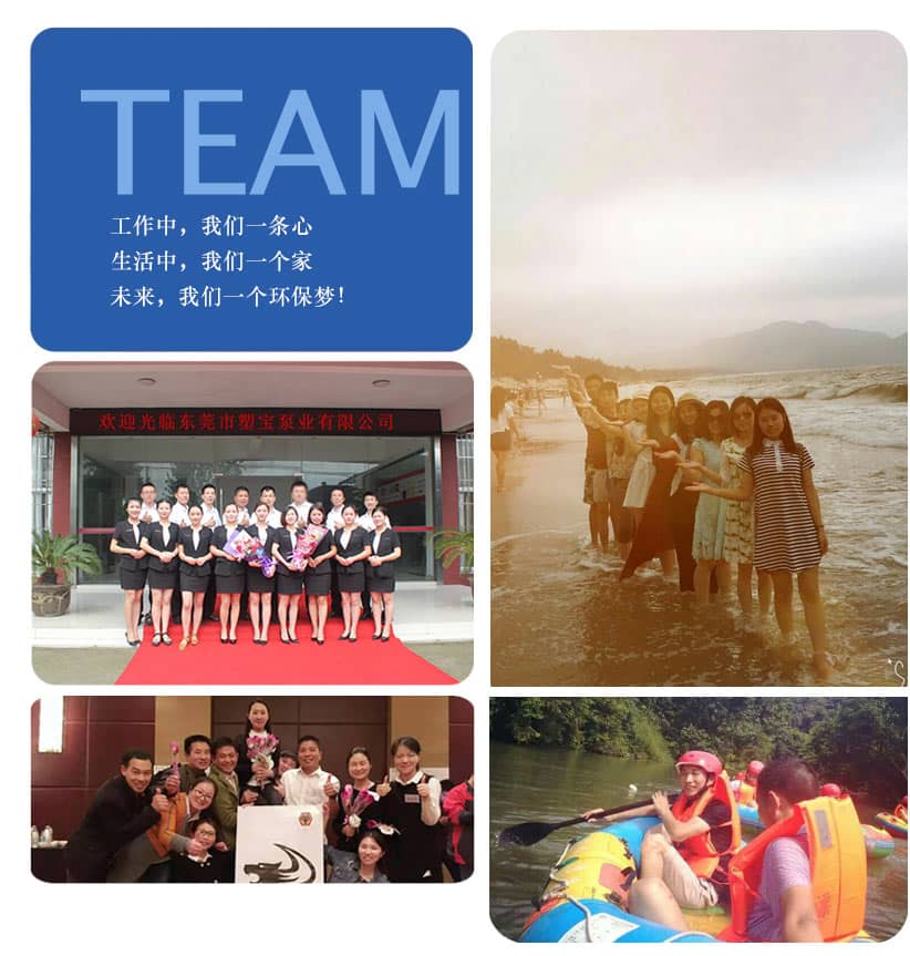 團(tuán)隊(duì)風(fēng)采》》東莞市塑寶泵業(yè)有限公司擁有強(qiáng)大的生產(chǎn)研發(fā)團(tuán)隊(duì)、經(jīng)驗(yàn)豐富的售后服務(wù)團(tuán)隊(duì)及營(yíng)銷型人才,公司員工擁有大專以上學(xué)歷,團(tuán)隊(duì)保持“年輕、活力、向上”的風(fēng)貌,迎合了東莞市塑寶泵業(yè)有限公司對(duì)“污水環(huán)保夢(mèng)”的追求,公司注重人才培養(yǎng)策略,為員工設(shè)立人性化的福利制度,并定期為員工報(bào)名高等培訓(xùn)課程,見證了“學(xué)習(xí)永不止步”的人才理念。